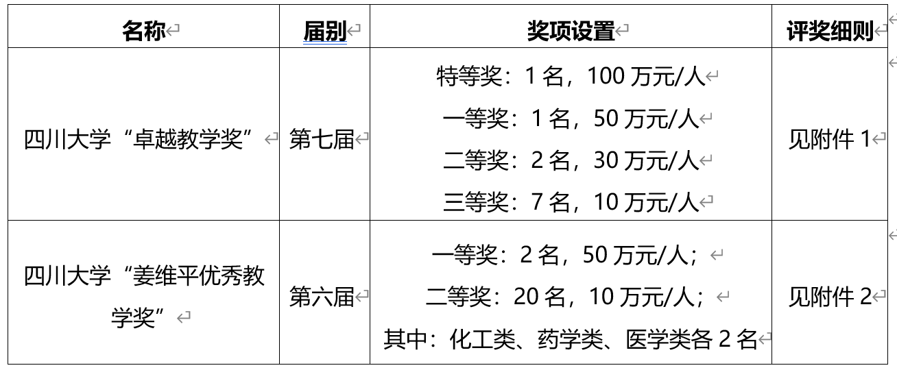 为表彰品德高尚、教学优秀、学术卓越的一线教师,使长期从事本科教学优秀教师的辛勤劳动和丰硕成果得到充分肯定与尊重,在全校形成尊师重教、爱岗敬业的育人氛围,现开展第七届四川大学“卓越教学奖”、第六届四川大学“姜维平优秀教学奖”的评选工作。