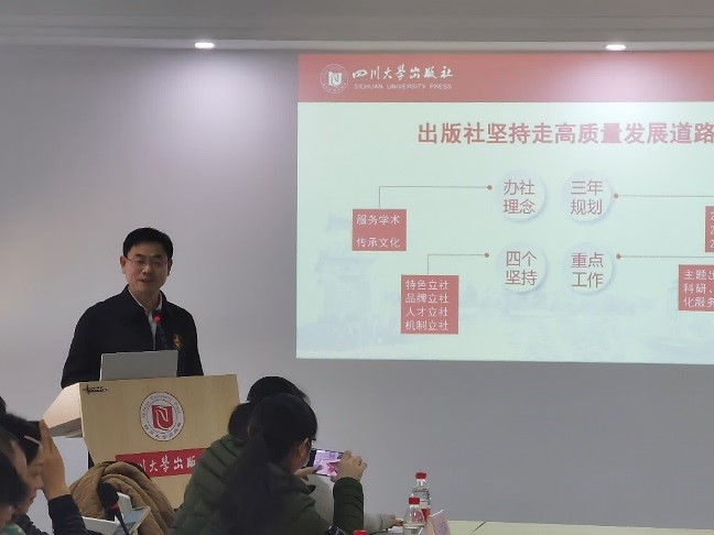 四川大学出版社社长王军以“坚持走高质量发展道路”为题,对出版社2020年度工作情况做了简要介绍。他从做好主题出版、服务教学科研、承担重大项目、推动文化服务、推动体制机制创新、实现社会经济效益双丰收等六个方面总结了出版社2020年度的工作成果,并介绍了出版社在“十四五”期间的工作重点。他指出,四川大学通识教育“一课一书”工作是当前出版社的重点工作之一,全社上下会全力做好组织保障工作,为课程建设及教材编写提供优质平台。