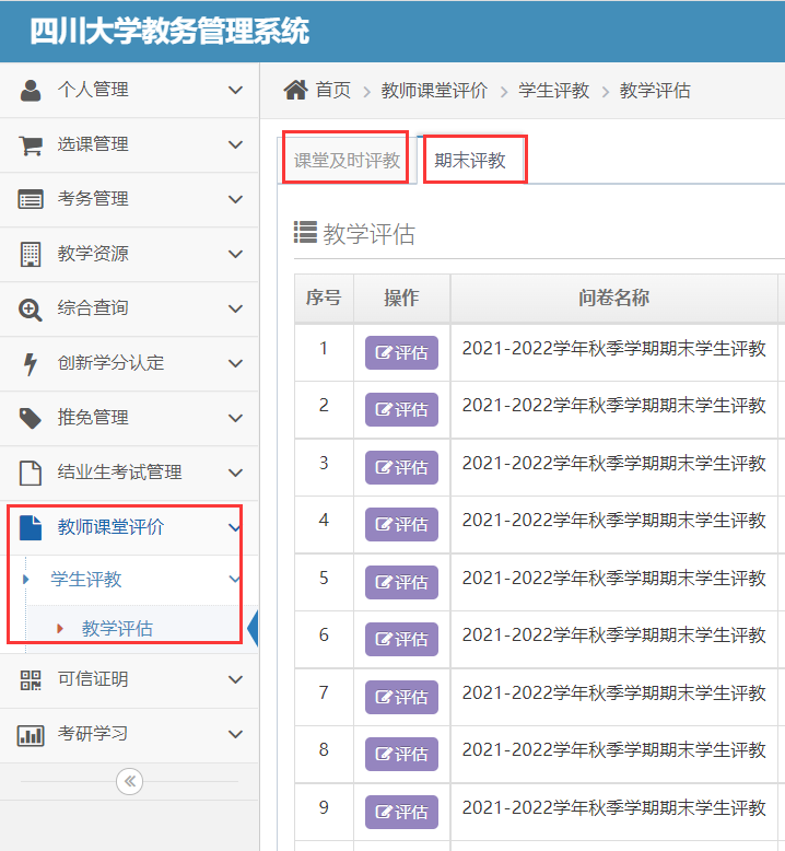 3.评教界面:登录“四川大学综合教务系统”学生端 (网址:)教师课堂评价-学生评教-教学评估-期末评教