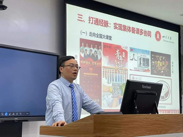 李建华副教授介绍了新时代背景下思政课面临的新挑战,分享了马克思主义学院推进思想政治理论课的改革与创新,深入介绍了学校思政课“五备四讲三跨”集体备课的建构、实施与推广,分享了学校提高思政课质量和水平的特色经验做法,展现了川大创新模式走向全国的经典案例。