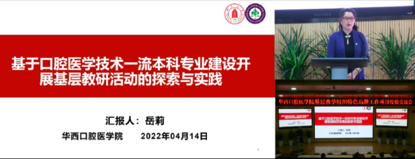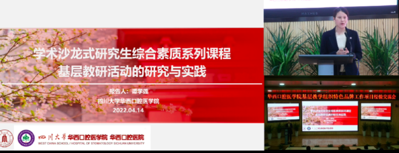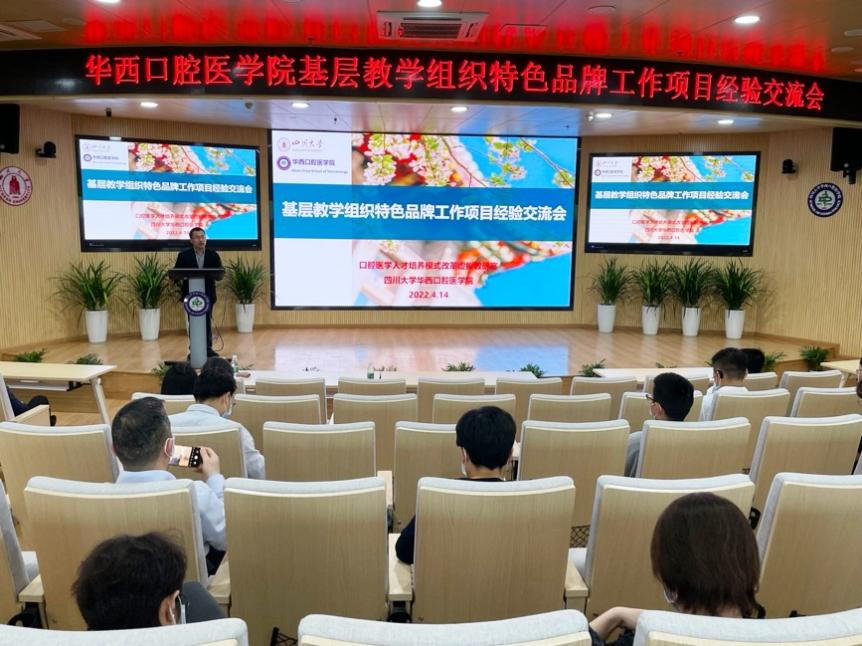 2022年4月14日下午16:00,四川大学基层教学组织特色品牌工作项目经验交流会(第二期)在华西口腔医学院学术报告厅举行。来自华西口腔医学院的4位基层教学组织特色品牌工作项目负责人分享了学院及各基层教学组织的有益做法和成效经验,发展规划处副处长孙克金、华西口腔医学院院长叶玲、副院长韩向龙以及各基层教学组织主任、部分基层教学骨干教师等出席交流会。