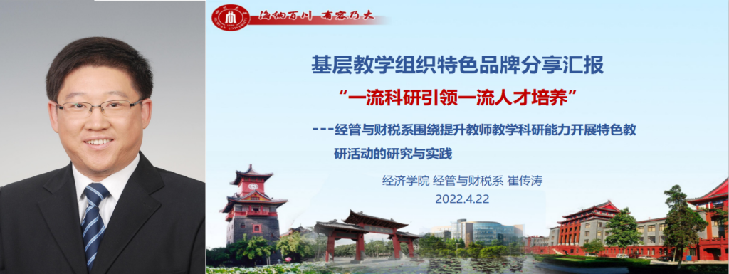 崔传涛副教授介绍了经管与财税系以“科研成果带动课堂教学”的有益经验。通过制定教师教学学术能力提升方案、以一流专业、一流课程、课程思政的建设为方向、课程建设中坚持“老带新、新帮老”、以重大科研项目、教学改革项目申请为依托,强化团队建设与合作等举措提升教师教学科研能力。