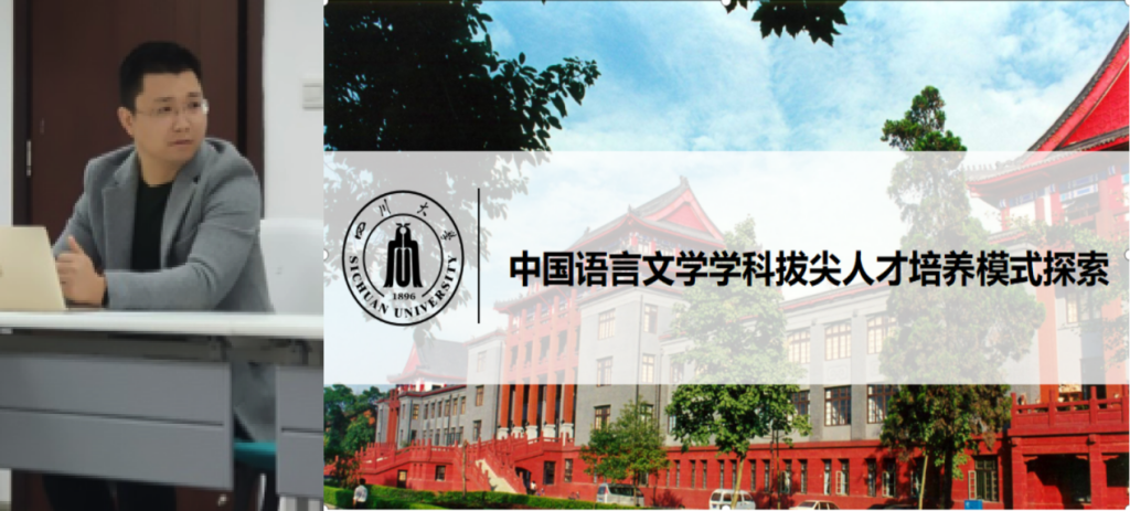 韩江华副教授通过“中国语言文学拔尖基地班”的建设实践,分享了文学与新闻学院基层教育组织在中国语言文学拔尖基地班各项制度创设、培养模式创新、课程设置优化、教授专家一对一培养、课外实践考察的经验,培养标准强调中国特色、川大风格,以此扎实提高人才培养质量。