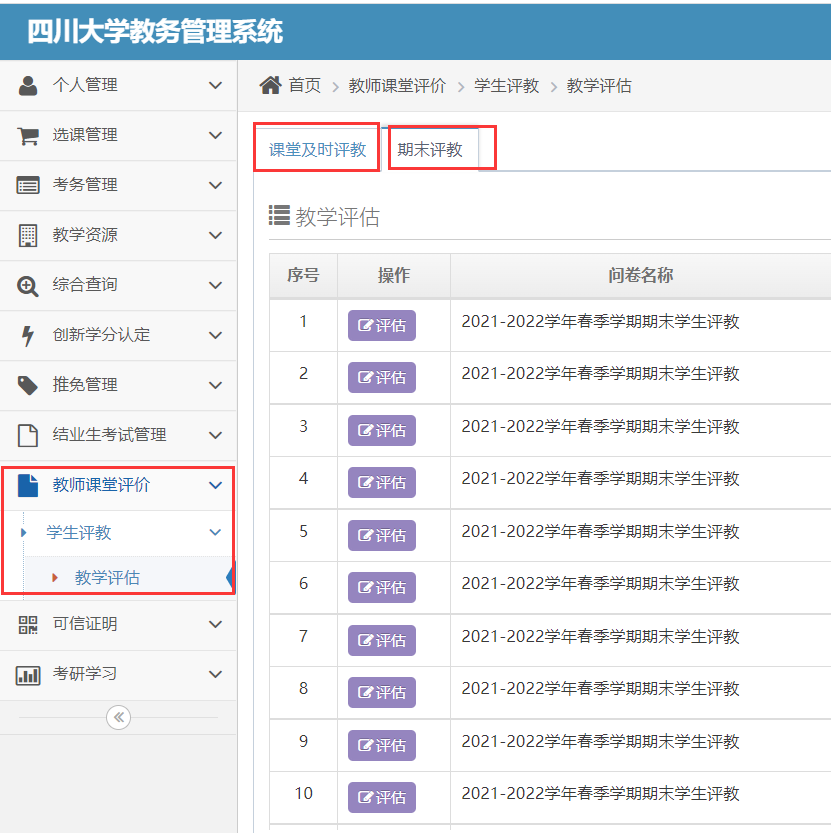 3.评教界面:登录“四川大学综合教务系统”学生端 (网址:)教师课堂评价-学生评教-教学评估-期末评教
