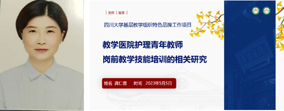外科护理学教研室主任龚仁蓉老师分享了《教学医院护理青年教师岗前教学技能培训的相关研究》将思政教育与专业知识有机融汇,设置返岗教研培训小组与课程,开展讲课比赛、以学促练、达成目标。为后期研究工作的顺利开展、外科护理学教研室青年教师的培训和发展奠定了基础。通过一系列调查和培训,使青年教师在职业素质、授课技能、专科知识、教学研究等方面快速成长,成为优秀的储备教师力量。