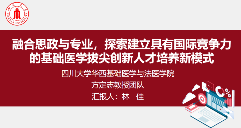 华西基础医学与法医学院林佳副教授从培养目标、实施方式、师资队伍建设、培养方式改革、项目成果等方面介绍了融合思政与专业,探索建立具有国际竞争力的基础医学拔尖创新人才培养新模式。