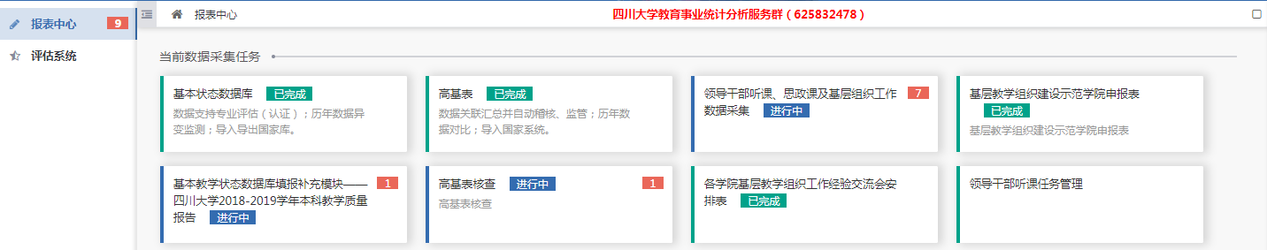2.各单位请使用每年报送本科状态数据的账号密码登录,对“报表中心”中红色画框的“领导干部听课、思政课及基层组织工作数据”采集任务栏目按时间节点要求进行数据上传和审核。