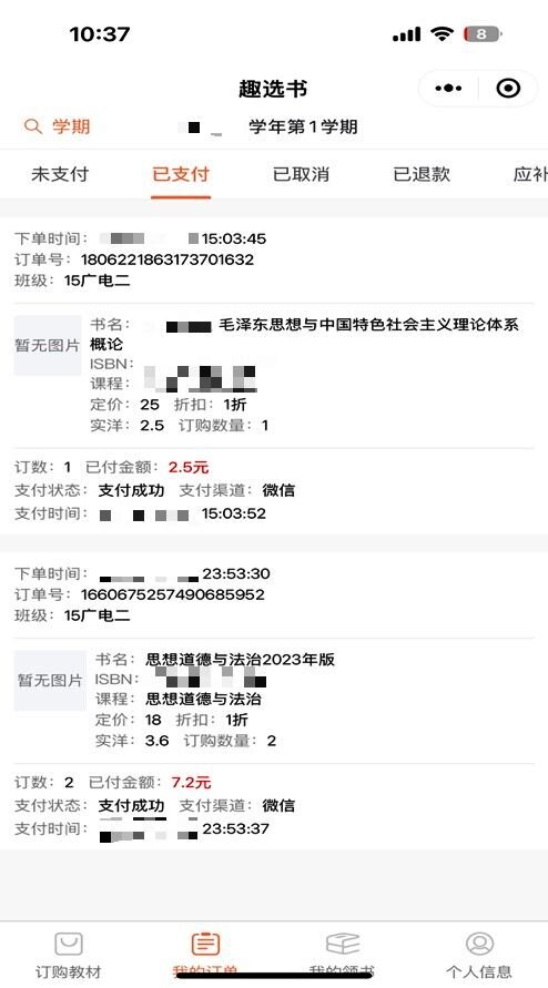 “提交并支付成功”后,可在“我的订单”板块查看已预订的教材信息(见图5所示)。