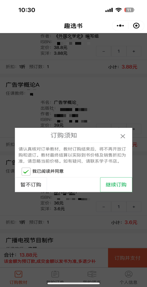 本次教材订购价格为预估价。已订购的教材在采购过程中,因教材改版、停版、停印等因素无法征订,或经任课教师确认更换教材并审核通过后,最终到校教材信息和价格可能发生变化。因此,本次教材订购先按照预估价格预付教材款,最终按实际到校教材定价的80%进行结算,“两课”和“国家政策性”教材不打折。