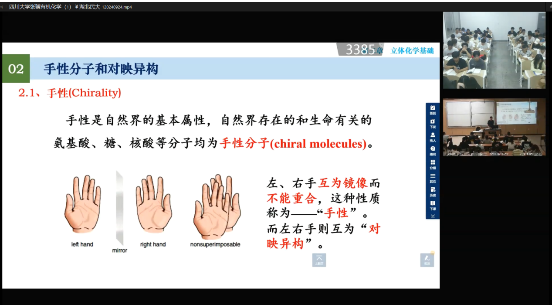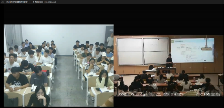 2024年9月24日,四川大学化学学院张骥老师正在江安校区综合楼c105讲授“有机化学(i)-1”课程“立体化学基础”部分。与此同时,湖北民族大学的化学课堂上,曹宇老师课程的同学们也通过智慧教室与在线课程平台的直播功能,与四川大学的学生们同步学习,共享老师的精彩教学。