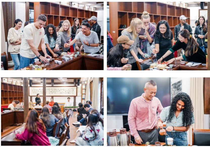 在茶艺体验环节,老师利用专业茶器展示了具体的泡茶方法。泡茶、品茶,通过动手操作,各国同学深入体验了中国茶艺。在体验环节中,各国同学踊跃发言,就茶的类别、不同茶叶的口感差异、不同国家茶文化的比较等问题进行了热烈讨论,展现出对中华优秀传统茶文化的浓厚兴趣。