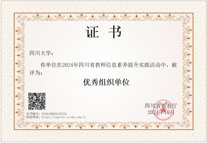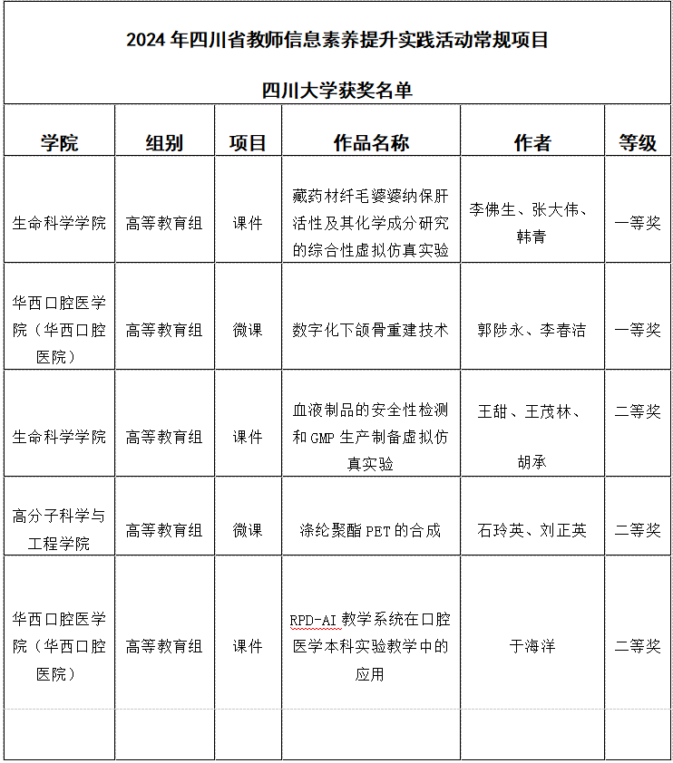 近日,2024年四川省教师信息素养提升实践活动常规项目获奖名单揭晓,经全省1470件作品严格评审,四川大学教师参赛作品获一等奖2个,二等奖3个,其中生命科学学院李佛生和华西口腔医学院(华西口腔医院)郭陟永教师团队荣获一等奖,生命科学学院王甜、高分子科学与工程学院石玲英和华西口腔医学院(华西口腔医院)于海洋教师(团队)荣获二等奖。同时四川大学荣获“优秀组织单位”奖,教务处教师教学发展科刘颖慧获得“优秀组织者”。
