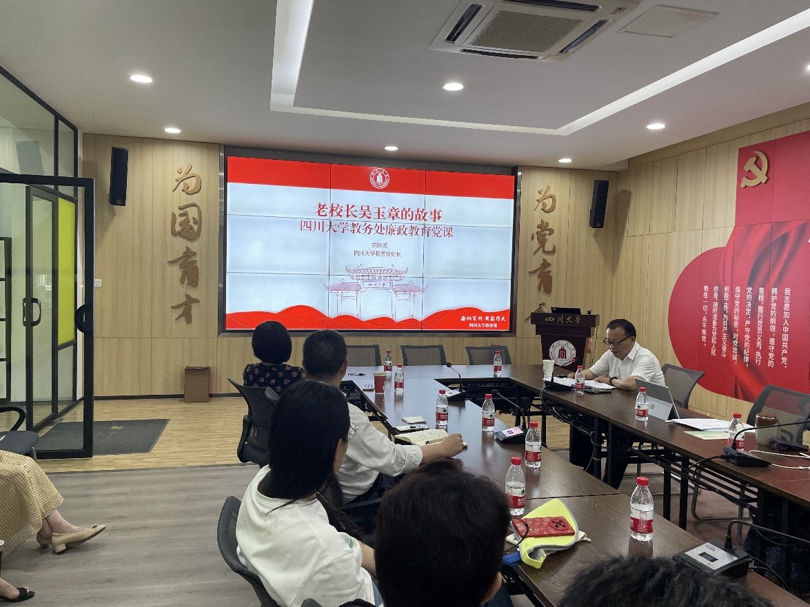 党支部书记党跃武讲授廉洁专题党课,以“老校长吴玉章的故事”为题讲述了无产阶级教育家、国立成都高等师范学校(四川大学)校长吴玉章的廉洁故事。党跃武通过讲述 “这才是真正的爱”——吴玉章与吴本清;“中国只有一条光明大道”——吴玉章的家教;“不为当官,只为共和吴玉章的本位”;“哭无益于事”——吴玉章与游丙莲四个故事,介绍了吴玉章老校长心系大众、甘于清贫,致力于为人民谋幸福的一生”“关爱学生、勤勉治学,致力于为青年谋发展的一生”和“不忘初心、牢记使命,致力于为民族谋复兴的一生”。党跃武强调,要学习吴玉章老校长 “一贯地有益于广大群众”的高尚品质,争做与人民同甘苦的标杆;学习他“一贯地有益于青年”的责任意识,勇做与时代同进步的典范;学习他“一贯地有益于革命”的坚定信念,誓做与民族同奋斗的先锋。