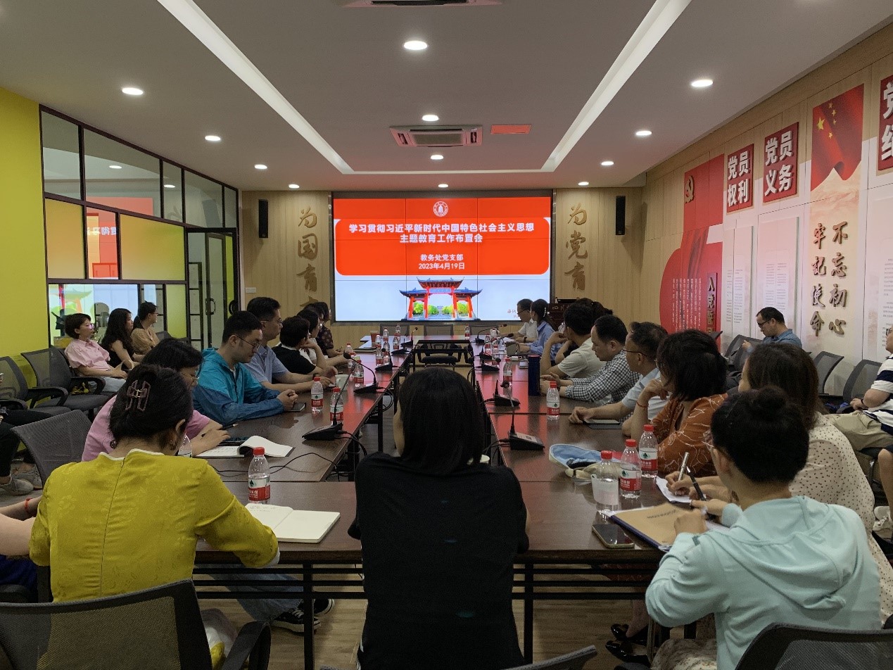 教务处党支部第一时间响应学校和机关党委主题教育的统筹安排,4月19日下午,在望江校区基础教学楼a315室召开学习贯彻习近平新时代中国特色社会主义思想主题教育工作布置会,教务处全体职工参加了会议。
