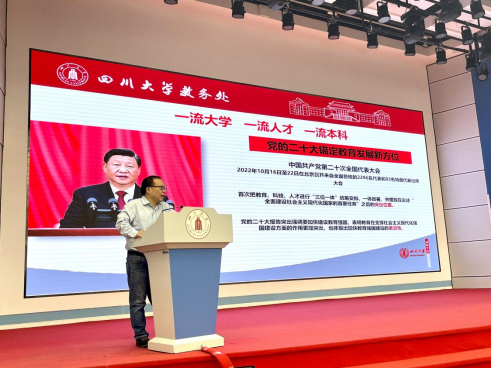 为贯彻落实习近平总书记关于教育的重要论述和党的二十大精神,共同研讨交流如何高质量建设学校一流本科课程,推动主题教育走实走深,2023年5月10日下午,由四川大学教务处主办的“高质量熔铸川大‘金课’暨第三批国家一流课程申报动员会”在望江校区汇文演播厅顺利开展。参会的有各学院(系)教学院长、一线教师和教学管理人员代表共计300余人。