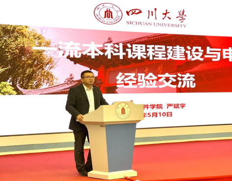 接下来,国家一流课程《计算机通信与网络》的负责人、软件学院严斌宇副院长就一流课程建设与申报作了细致的经验分享。他从课程建设、政策解读、申报书撰写、相关材料准备等多方面,结合典型案例,为与会人员进行讲解与建议。