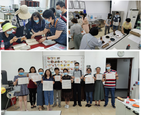 随后,在古籍修复室里,全体同志学习了古籍修复流程、古籍常见的破损类型、成因以及修复原则,并在图书馆特色资源中心老师们的指导下,现场体验了古籍雕版印刷的操作,感叹古籍修复技术的高难度以及需要具备的持久耐心。