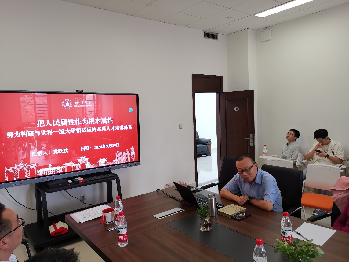 教务处处长党跃武以“把人民属性作为根本属性,努力构建与世界一流大学相适应的本科人才培养体系”为题,带领大家学习第二十届三中全会精神。他强调,我们要把学习全国教育大会精神融入到一流本科人才培养过程中,要让教育的政治属性更加彰显、人民属性更加鲜明、战略属性更加突出;要准确理解高等教育与社会的关系,要深刻认识高等教育的新环境,要积极回应高等教育的新任务,坚定不移走中国特色社会主义教育发展道路。