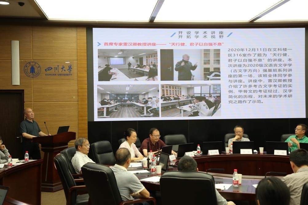 会议交流环节,文学与新闻学院雷汉卿教授率先发言。雷汉卿教授阐释了学院对强基计划人才培养的全方位思考,包括洞悉国家和学校最新人才培养理念;完善培养方案、规划学术发展;遴选专业导师,优化师资队伍;开设系列讲座,开拓学术视野等方面。作为指导教师,他推动学生践行知行合一,增进合作交流,带领学生赴河南郑州大学、安阳中国文字博物馆开展学术交流。为夯实专业基础,强化动手实践,他带领学生进行古文字临摹实践。雷老师最后总结到:“上好一门课,要身体力行感召学生”。