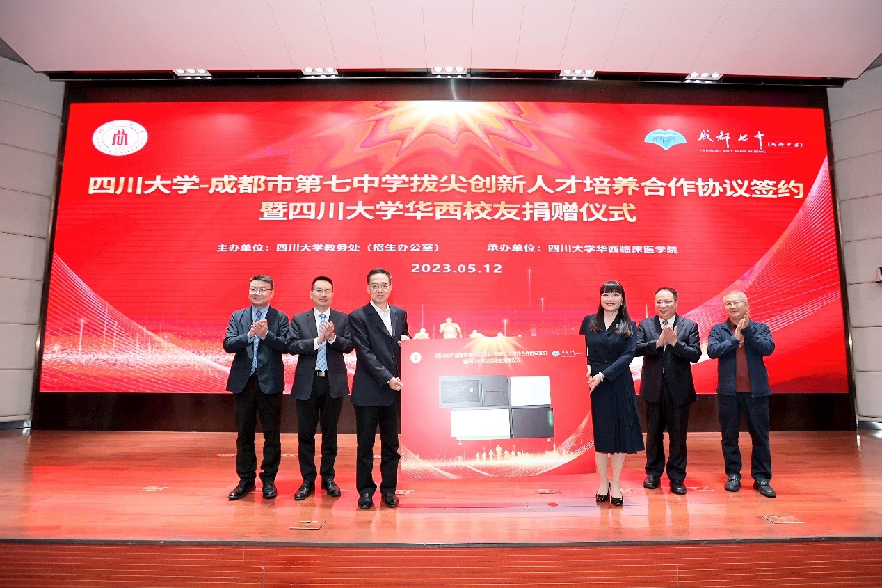 四川大学华西校友向成都七中捐赠活动中,四川大学华西临床医学院党委书记李正赤首先致辞。他表示,高中是拔尖创新人才早期培养的重要阶段,起着承上启下的关键作用。华西临床医学院将发挥科研、学科和平台优势,特别是充分发挥川大华西的名师大家、学科领军人才、临床专家,尤其是像许四虎校友这样的川大华西校友的力量,通过共同建设生物医学实验室、创建华西优秀中学生医学夏令营、共享国际教育资源等方式,与七中加强合作共创,形成拔尖创新人才培养的“川大-七中”模式。