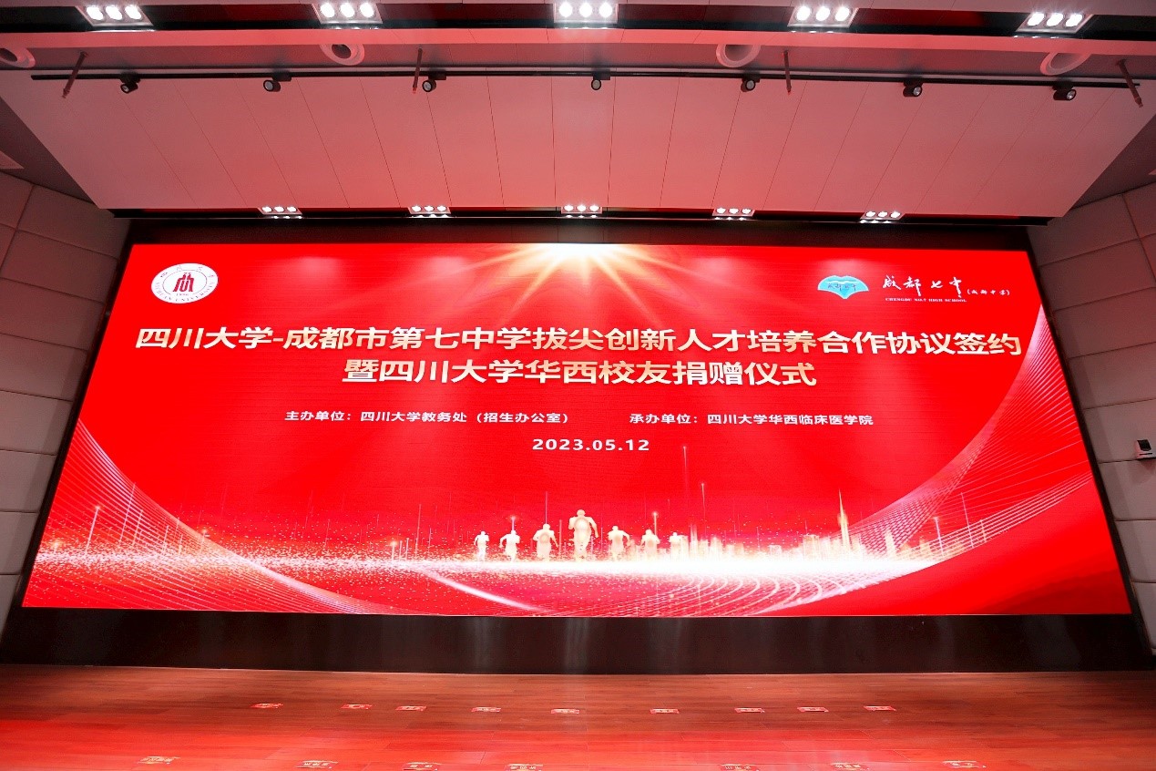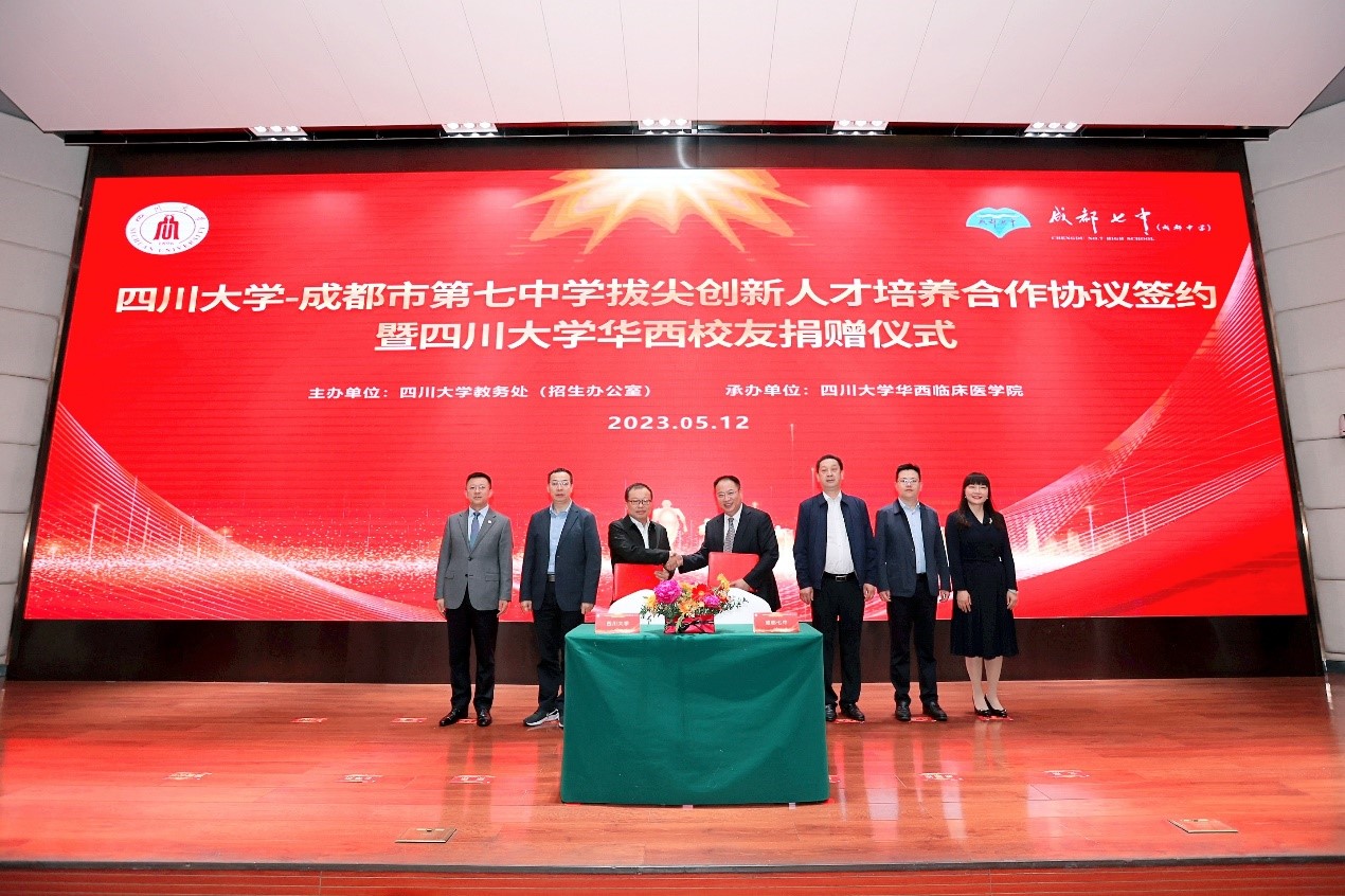 5月12日上午,四川大学-成都市第七中学拔尖创新人才培养合作协议签约暨四川大学华西校友捐赠仪式在四川大学双创中心圆满举行。本活动作为落实习近平总书记“全面谋划基础学科人才培养”的重要指示精神,推进“中学生英才计划”和“强基计划”“拔尖计划2.0”有机衔接的重要举措,在深入开展学习贯彻习近平新时代中国特色社会主义思想主题教育的背景下举行。四川大学与成都七中现场签订《四川大学与成都七中拔尖创新人才培养合作协议》,聚焦基础学科和科技前沿,从拔尖创新人才早期识别、人才共育、课题共研、特色共创等方面共同开展探索与创新。四川省教育厅二级巡视员胡必军、四川大学副校长游劲松、成都市第七中学校长易国栋、四川大学华西临床医学院党委书记李正赤和四川大学华西校友、华大基因高级副总裁许四虎分别为会议致辞,成都市第七中学校友、中国工程院院士、四川大学教授张兴栋通过视频致辞。成都市教育局普教处副处长何佳、四川大学教务处处长党跃武、成都市第七中学党委副书记兼高新校区执行校长史玉川、副校长蔡泽勇出席会议,来自成都市树德中学、成都市锦江区嘉祥外国语高级中学、天府第七中学、成都金苹果锦城第一中学、四川大学附属中学、绵阳南山中学和四川师范大学附属中学的代表作为嘉宾莅临现场。四川大学教务处(招生办公室)、对外联络办公室和开展基础学科拔尖创新人才培养计划的12个学院的80余名师生代表也参与了见证。活动由四川大学教务处副处长兼招生办公室主任张磊主持。