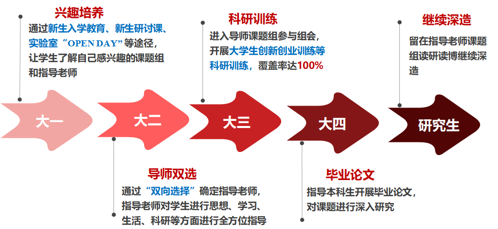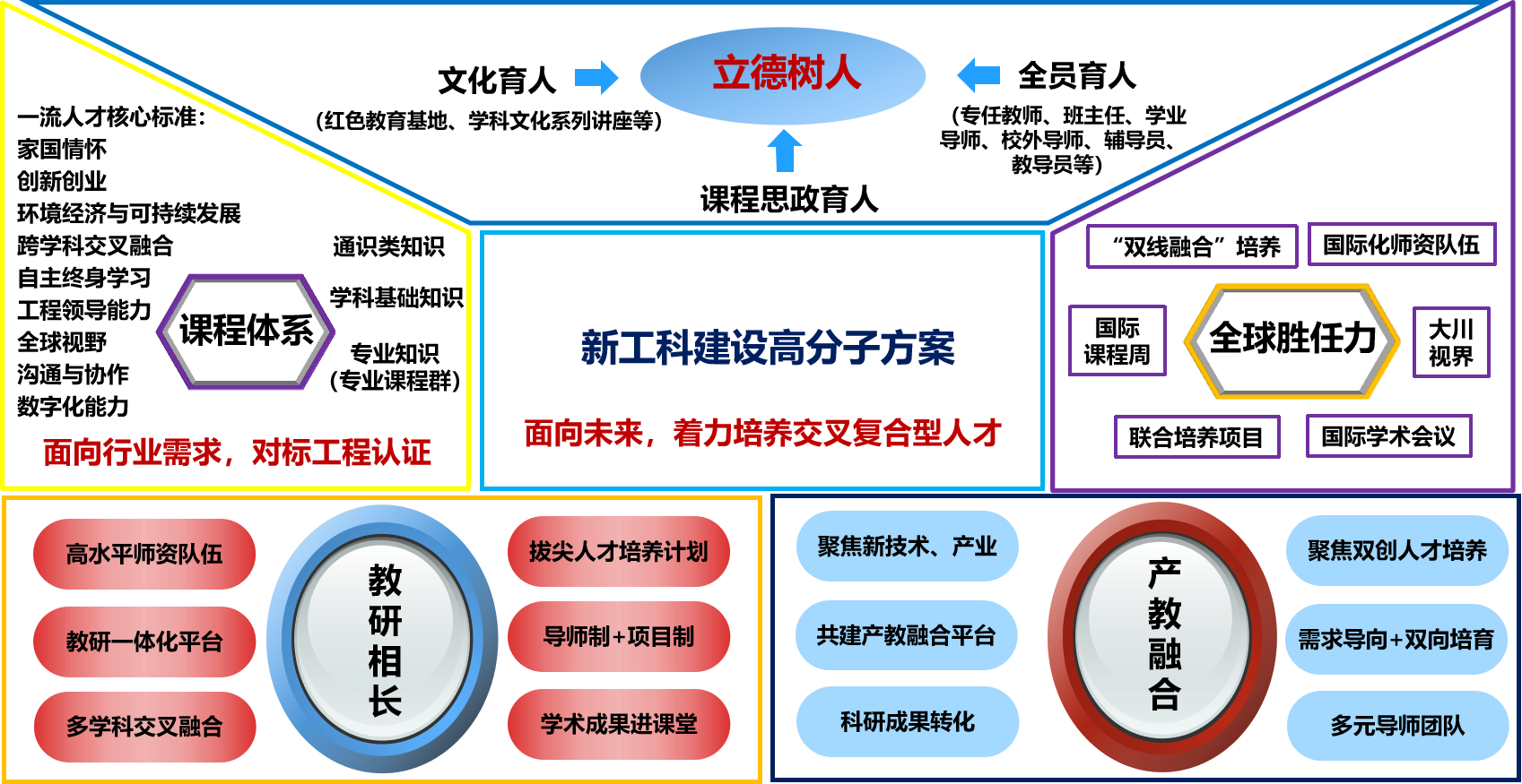 因材施教:通过开展“一条龙、全过程”导师制,实施卓越工程师计划、“先进高分子材料工程创新班”、“本硕博贯通式未来领军人才培养计划”和“荣誉学士学位计划”等分层次人才培养计划实现“全方式”育人,更好地发挥学科学术优势和师资优势,促进教研融合,对学生进行分类培养、因材施教。