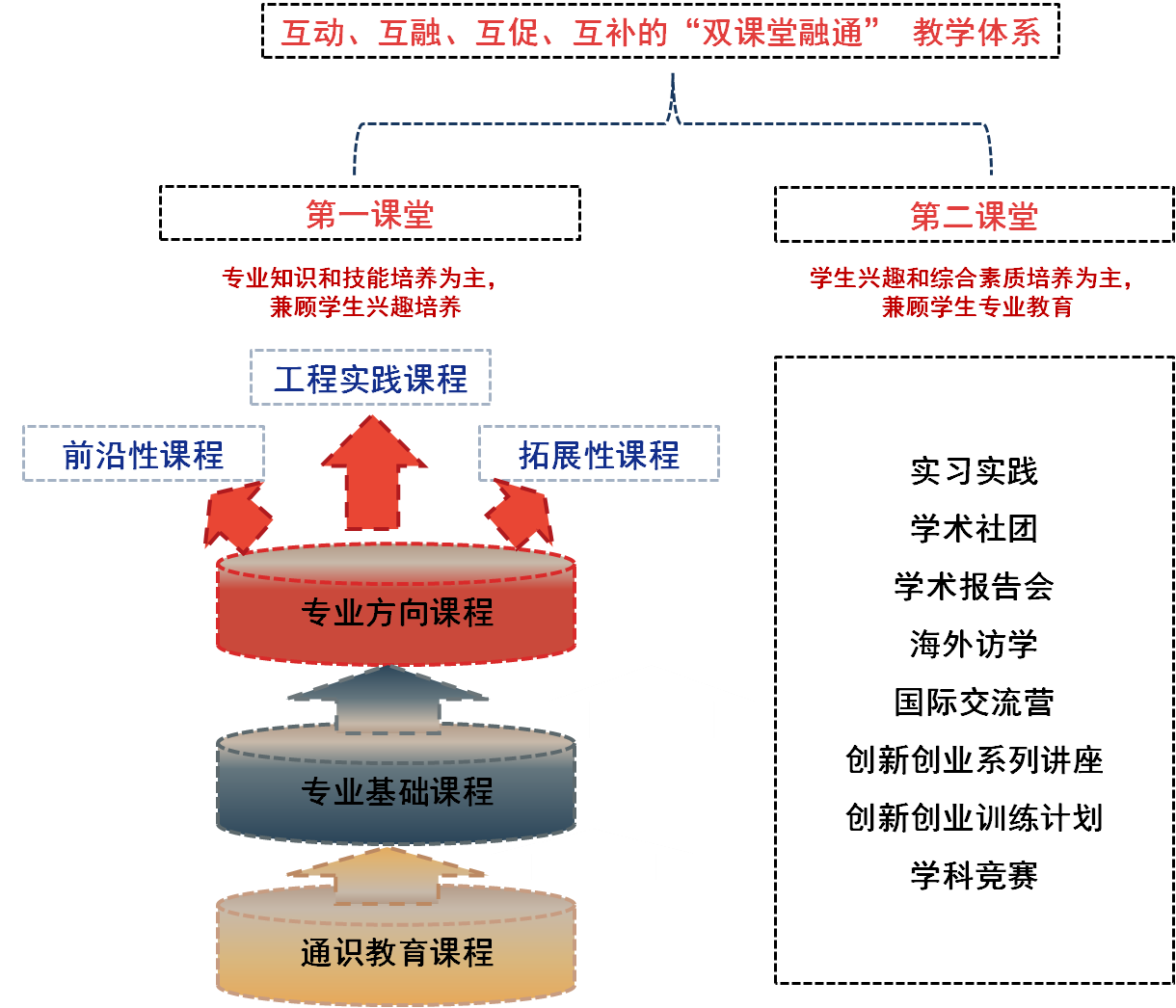 “双课堂融通”的教学体系:通过构建第一课堂与第二课堂融通的教学体系,树立“双课堂”相结合的育人理念,以学生为中心,将育人贯穿学生的学习和生活全过程,实现“全过程”育人。
