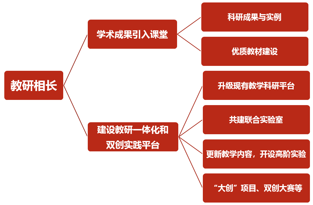 教研相长:依托一流学科优势,以卓越学术引领一流的教学,构建了教学和科研深度融合的新途径。注重学术成果引入课堂,同时全面升级教研一体化和双创实践平台建设。依托本学科的高分子材料工程国家重点实验室、国家级材料科学与工程实验教学示范中心等教学科研机构,积极共建校企联合应用实验室,升级教研一体化和双创实践平台建设。