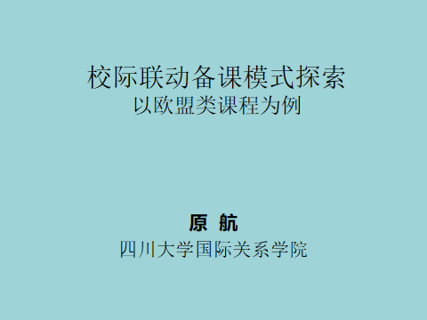 原航副教授介绍了校际集体备课模式的探索。分享了课程团队与清华大学、复旦大学、同济大学、广东外语外贸大学等高校相关学者的教研合作,初步摸索出一条适合国情的创新型、开放式、共享性课程建设新路径。团队探索了面向未来、前沿性的教学思路,注重通识性、文化性、思想性和启发性相结合,在打通闭环、迭代升维、教研赋能等方面取得良好效果。