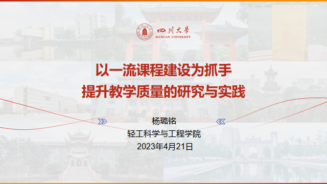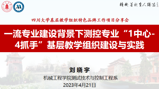 2023年4月21日下午,四川大学基层教学组织特色品牌工作项目经验交流会(第九期)在望江校区机械工程学院323报告厅成功举办。数学学院几何与代数课程群虚拟教研室带头人彭联刚教授、轻工科学与工程学院服装与服饰设计系系主任杨璐铭教授、水利水电学院水利水电工程系系主任李艳玲教授、电子信息学院课程团队成员王策副研究员、机械工程学院测试技术与控制工程系副系主任刘晓宇副教授、国际关系学院课程团队负责人/四川大学波兰与中东欧问题研究中心副主任原航副教授、马克思主义学院习近平新时代中国特色社会主义思想概论教研室副主任肖孟夏副教授分别做分享发言,会议由机械工程学院院长助理、测试技术与控制工程系副系主任刘晓宇主持。